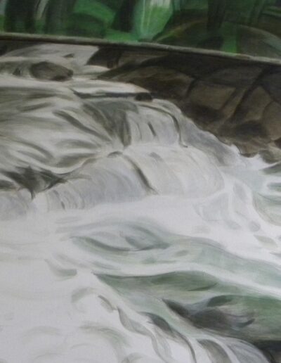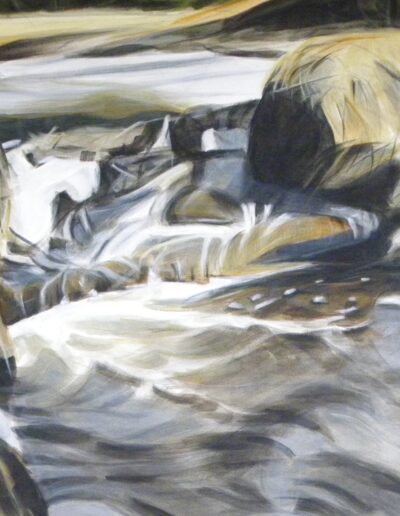Les racines dans l’eau, est un projet basé sur les thèmes de l’empathie et de l’eau et il implique sa fratrie (1 frère et 6 soeurs). «Je reçois une photo d’un plan d’eau aimé de chacun. Dans le premier volet je peins un tableau en pensant à chaque frère et soeur. Dans le deuxième volet, je travaille à partir de la même image en pensant à moi. Les tableaux sont peints à l’acrylique sur toile.»