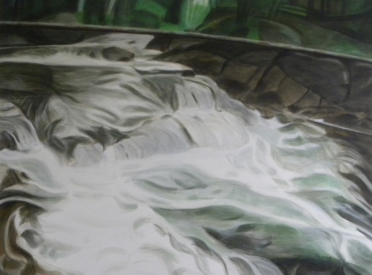 Les racines dans l’eau, est un projet basé sur les thèmes de l’empathie et de l’eau et il implique sa fratrie (1 frère et 6 soeurs). «Je reçois une photo d’un plan d’eau aimé de chacun. Dans le premier volet je peins un tableau en pensant à chaque frère et soeur. Dans le deuxième volet, je travaille à partir de la même image en pensant à moi. Les tableaux sont peints à l’acrylique sur toile.»